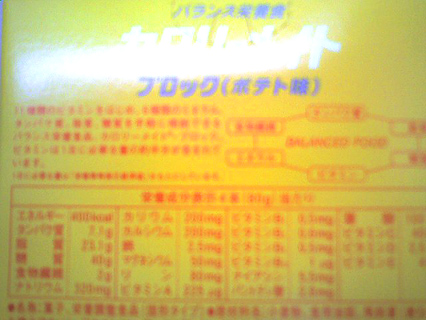 これを題材にした小説描いたよ。 カロリー栄養食ポテト味。昔よりいささか味が変わってたような気がします。昔の味のが好きだったなぁ。なくなってたのに、復活したらしい。嬉しいけどね。5年ぶりに食べた味は懐かしかった。おいしかったです。これ系ってまずいイメージあったので、最初食べたときも「おいしいんだ!?」って驚いた記憶ありましたが、今回も同じこと思った(笑)写真がいい感じにてかりで見えないのは意図してますが、不可抗力でもあります(え)